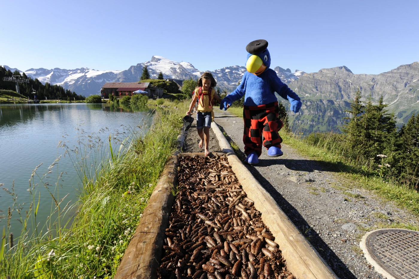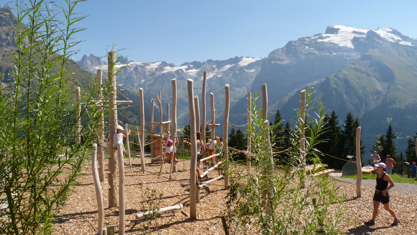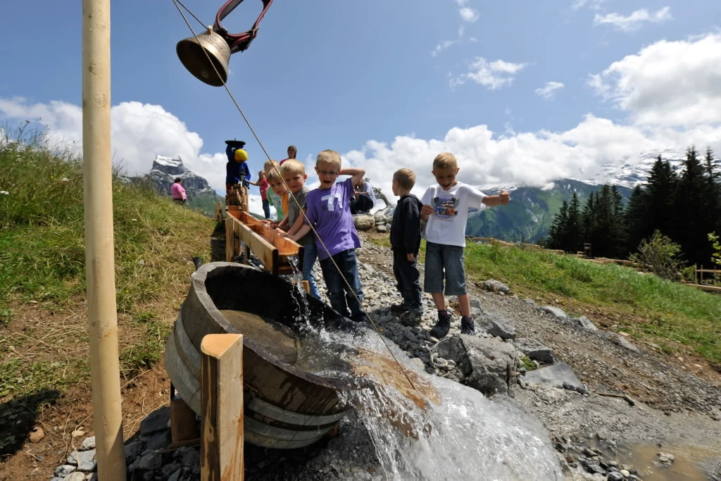 - Globis Alpenspielplatz mit grosser Kletter- und Balancierlandschaft, eine Wasserwelt mit Pumpen und Kippen, Globi-Federwippen, Trampolin und vielem mehr