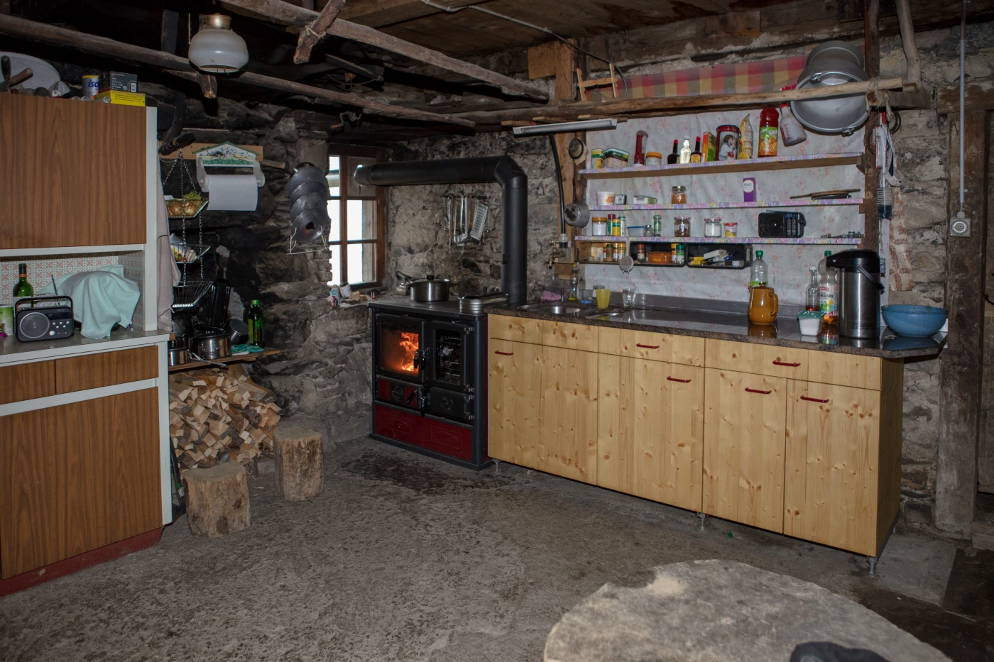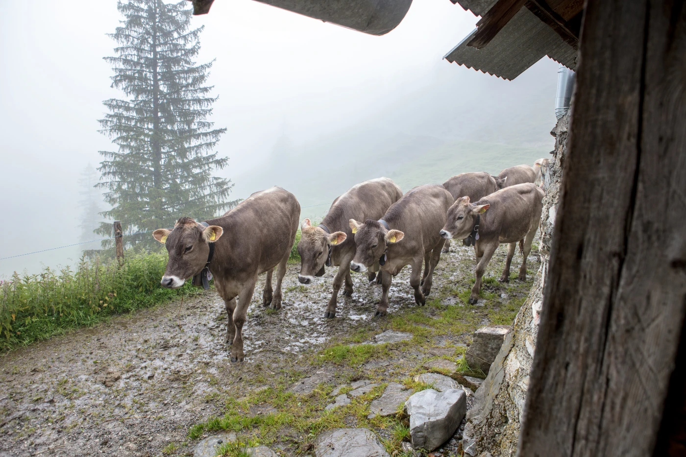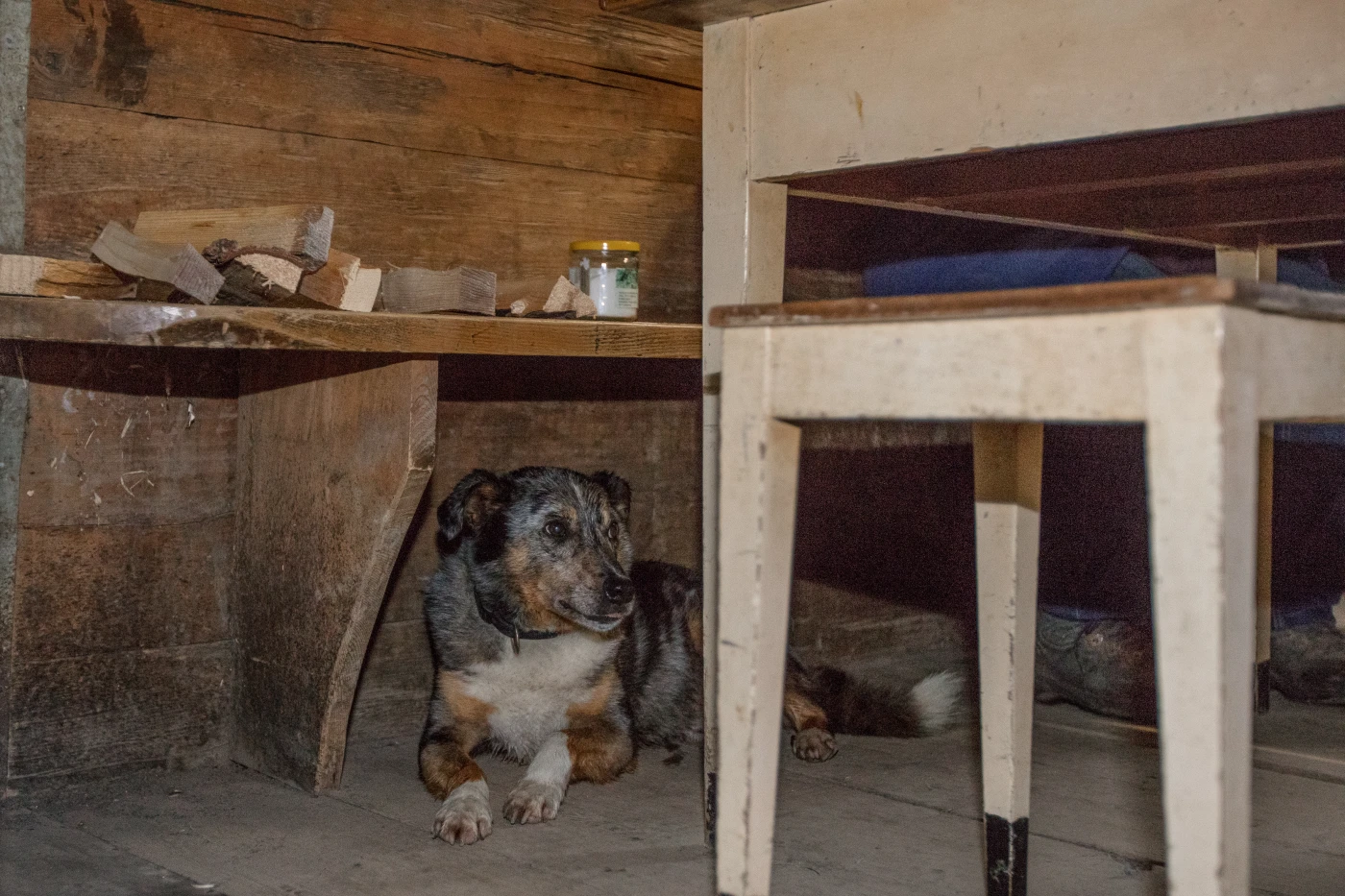 Seit dem Regensommer 2014 findet sie weniger Gefallen am Regenwetter – wie beispielsweise bei unserem Besuch auf der Alp. Da liegt sie lieber in der Hütte bei Vroni in der urtümlichen Küche. Zwischendurch schauen die neugierigen Kühe durchs Küchenfenster und scheinen den Topf mit den Älplermagronen über dem Feuer erblickt zu haben. Kochen über dem Feuer muss im Übrigen einerseits geübt sein, anderseits ist auch Geschicktheit beim Lebensmittelvorrat angesagt: Der Vorratsraum ist gut ausgetäfert, allfällige Löcher gut gestopft und die Lebensmittel teilweise aufgehängt. Denn sind die Älpler nicht vor Ort, tanzen die Mäuse und nehmen all ihre Kräfte zusammen, um auf die eine oder andere Art an ihr Fressen zu gelangen. Während die Nagetiere im Hintergrund rascheln, tischt Vroni schmackhafte Älplermagronen auf. Die eingeritzten Zeichnungen auf dem Tisch erzählen Ereignisse aus der Vergangenheit und inspirieren die Fantasie des Betrachters.