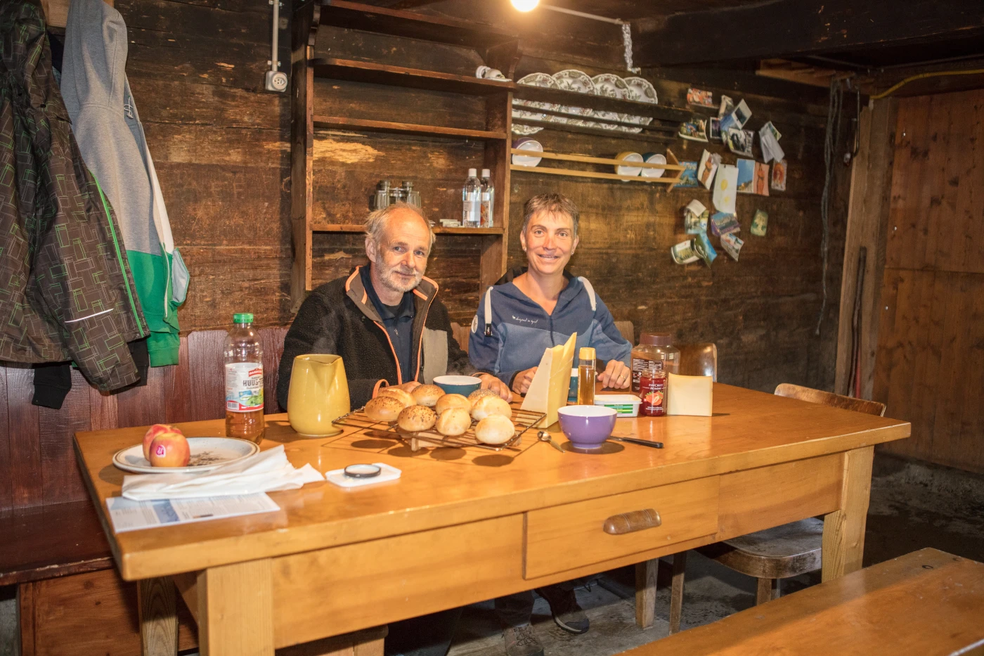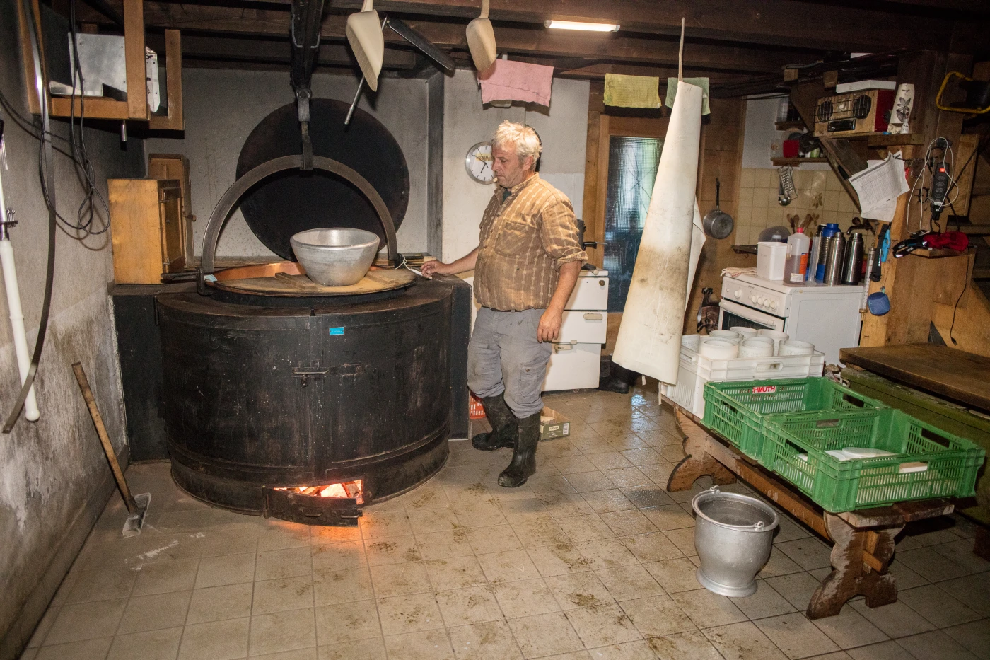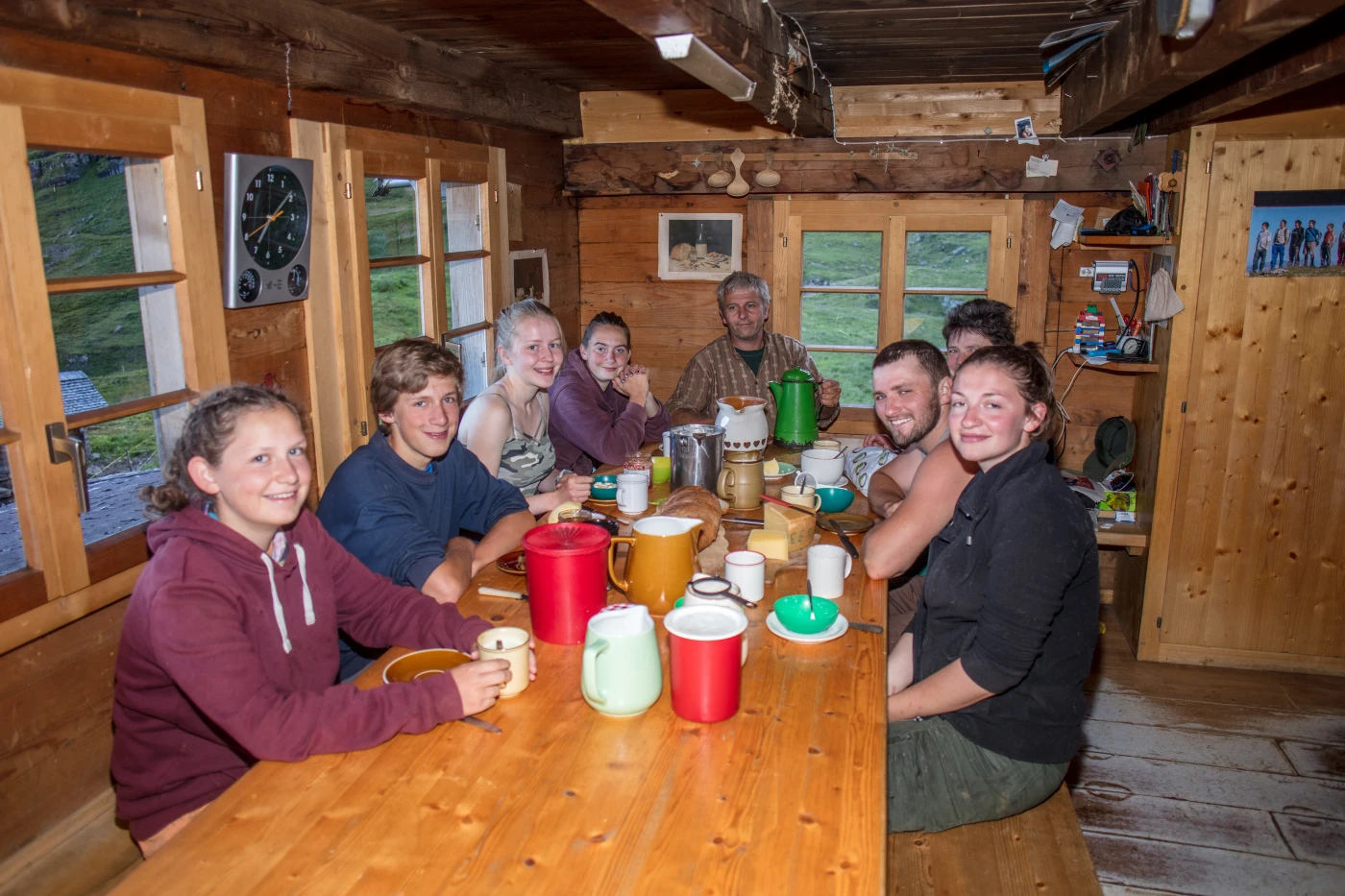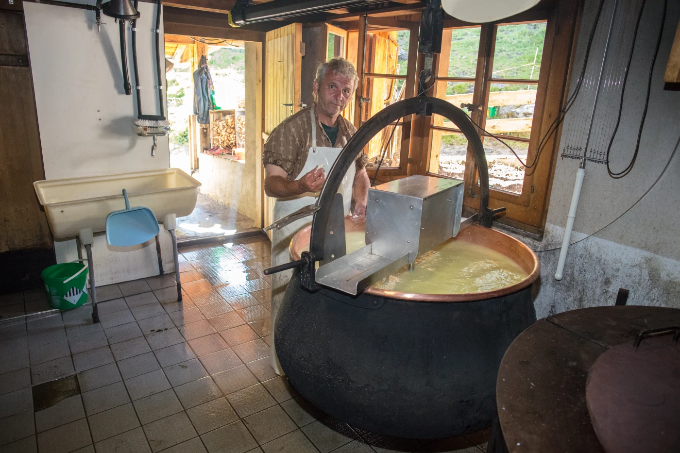 Auf der Alp Tschingelfeld gibt es zwei Alpwirtschaften. Während Paul Grossmann im Gebäude des Senntums Ringgenberg Käse herstellt, macht dies seine Frau im Gebäude des Senntums Brienz. Ken-nengelernt haben sich die beiden hier oben auf dem Tschingelfeld. Seither verbringen sie hier jeden Sommer. Von ihren sechs Kindern begleitet sie inzwischen nur noch Simon, welcher den heimischen Hof in Brienz sowie die Alpwirtschaft Schritt für Schritt übernehmen wird. Paul Grossmann: «Wenn ich 65 Jahre alt bin, soll der gesamte Übergabeprozess abgeschlossen sein. So haben wir bereits eine Generationengemeinschaft, durch welche Simon Besitzer von 50% der Kühe ist und laufend immer mehr übernimmt.»
