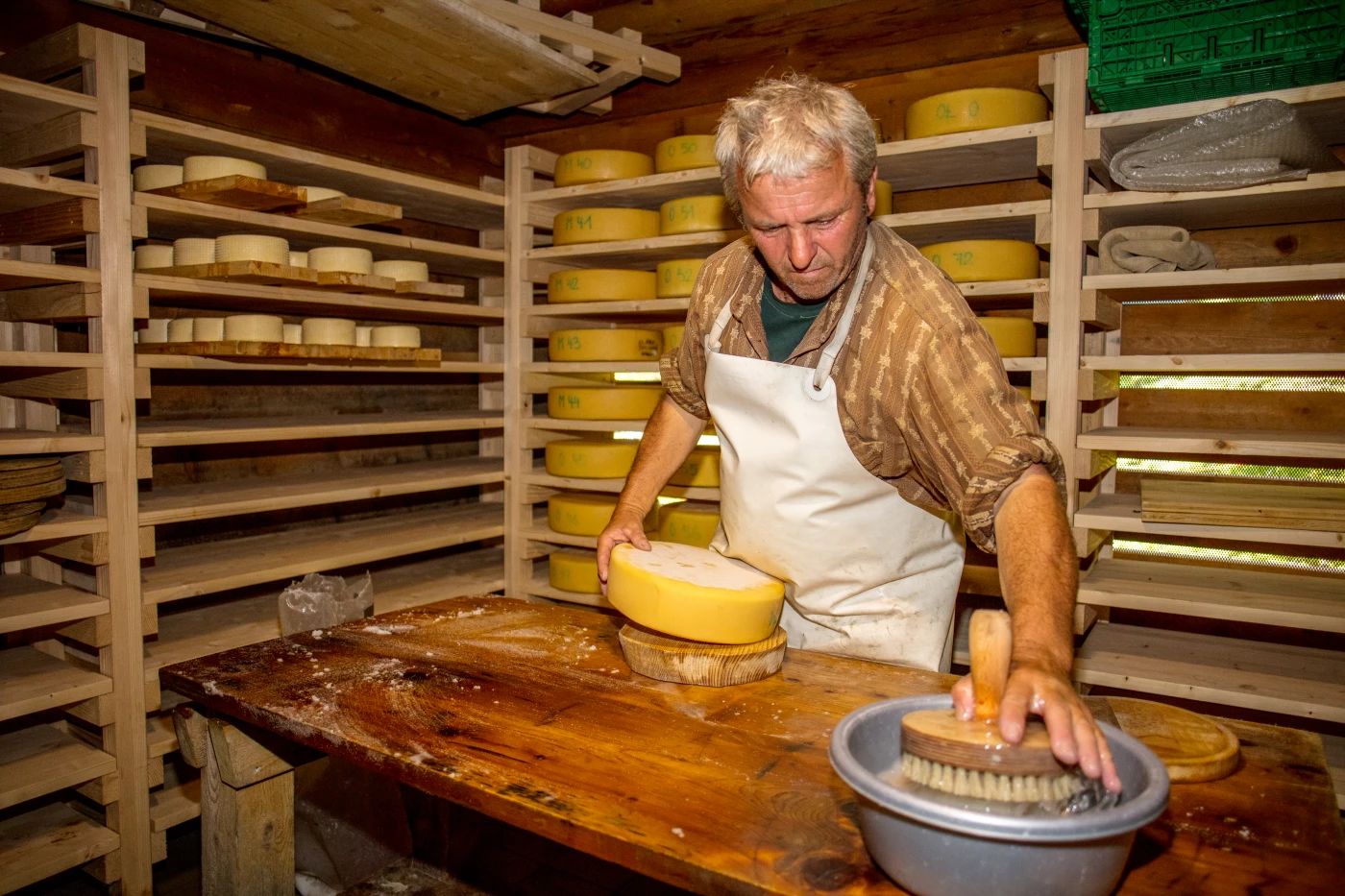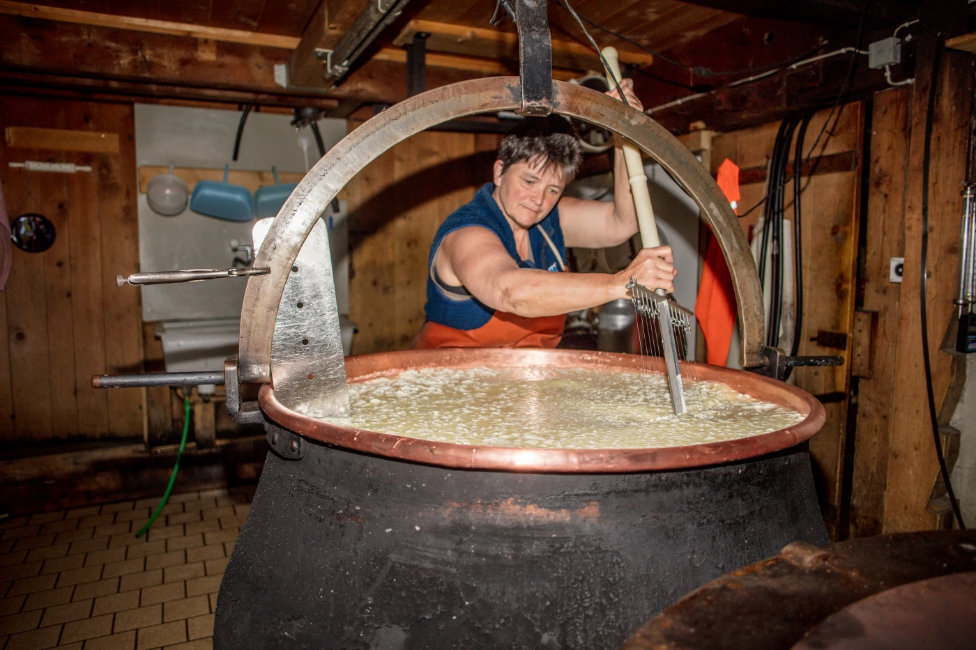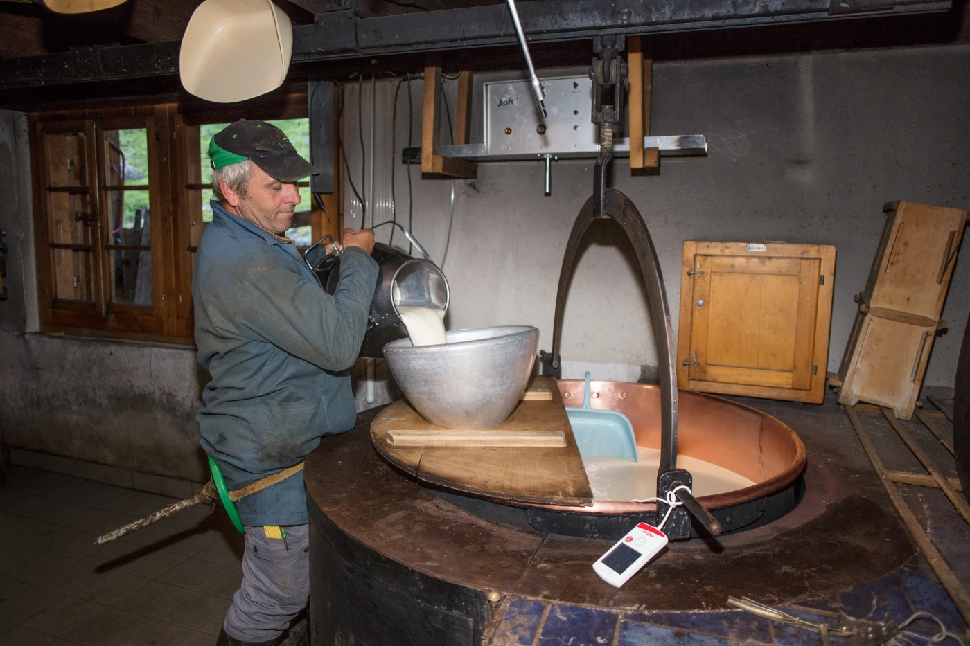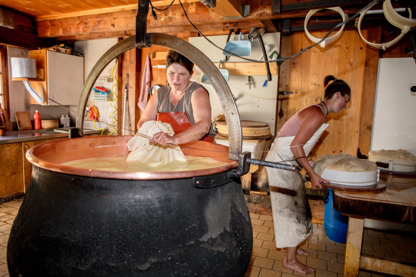Auf der Alp Tschingelfeld stellen Paul und Sibylle Grossmann in noch traditioneller Art und Weise ihren Berner Hobelkäse AOP her, welcher erst nach 18-monatiger Reifung in den Verkauf kommt. Beide erwärmen ihr «Chessi» mit Holz und heizen die täglich anfallende Menge von je 450 Litern Milch auf 50 Grad auf. Je nachdem können ihre 60 Kühe, die 20 Bauern gehören, sogar bis 1100 Liter geben. Und 11 Liter Milch ergeben 1 Kilogramm Käse. So entstehen bei den beiden täglich jeweils je 6 Laib bester handgemachter Käse. Kommt Ende September die Alpabfahrt, sind 5 Tonnen Käse oder gegen 600 Laibe entstanden, welche in fünf Hubschrauberflügen ins Tal gebracht werden. Paul Gross-mann: «Die Alpabfahrt und die darauffolgende ‹Chästeilet› ist für uns dann immer die Krönung einer Arbeit, die wir einfach nicht missen möchten.»