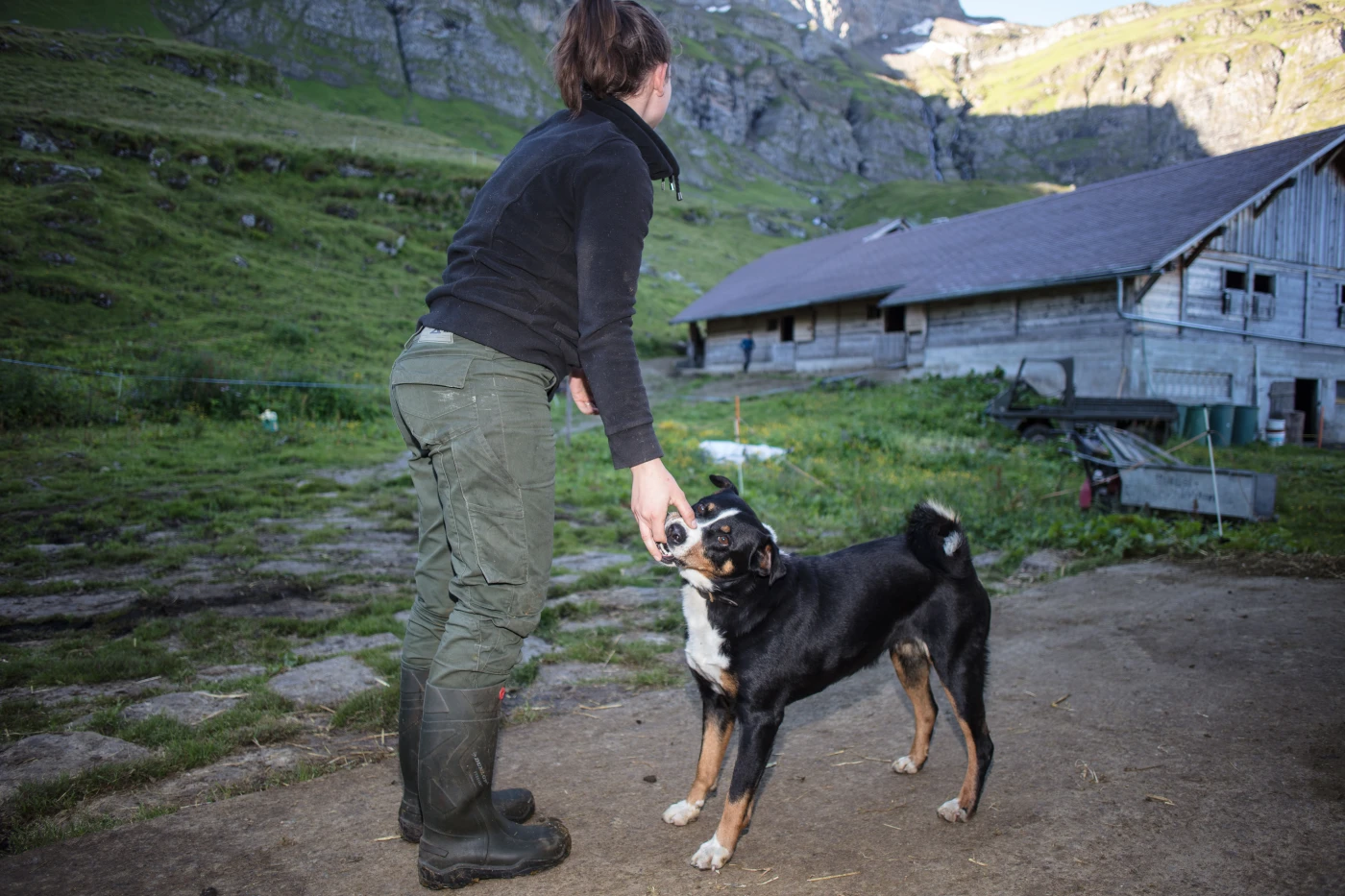 Hans hat mit Vroni einerseits eine Frau mit Herzblut für das Alpleben gefunden, anderseits für sich ein begeisterndes Betätigungsfeld mitten in der Natur. Ausserhalb seiner Alpzeit ist er als Lokführer auf den Schienen der Zentralbahn unterwegs, während den Tagen auf der Alp hält er den Steuerknüppel der Lok circa vier Tage pro Monat im Griff. Die 70 Rinder stammen von verschiedenen Bauern aus dem Luzernerland, aus Zug und Nidwalden. «Morgens gehe ich meinem Vieh nach und mache die Runde.» Mit seiner inzwischen 30-jährigen Erfahrung im Umgang mit den Tieren weiss er bereits beim Anblick aus der Ferne, wie es um seine Herde steht. «Die Rinder benötigen Streicheleinheiten wie wir Menschen; auch ist jedes Tier auf seine Art eigen. Ein kurzes Gespräch mit den einzelnen Tieren ist nicht selten, sie lieben meine Erzählungen.» Bleika, die Sennenhündin, hilft ihm bei seiner Arbeit und treibt in ihrer gemütlichen Art die Rinder vorwärts.