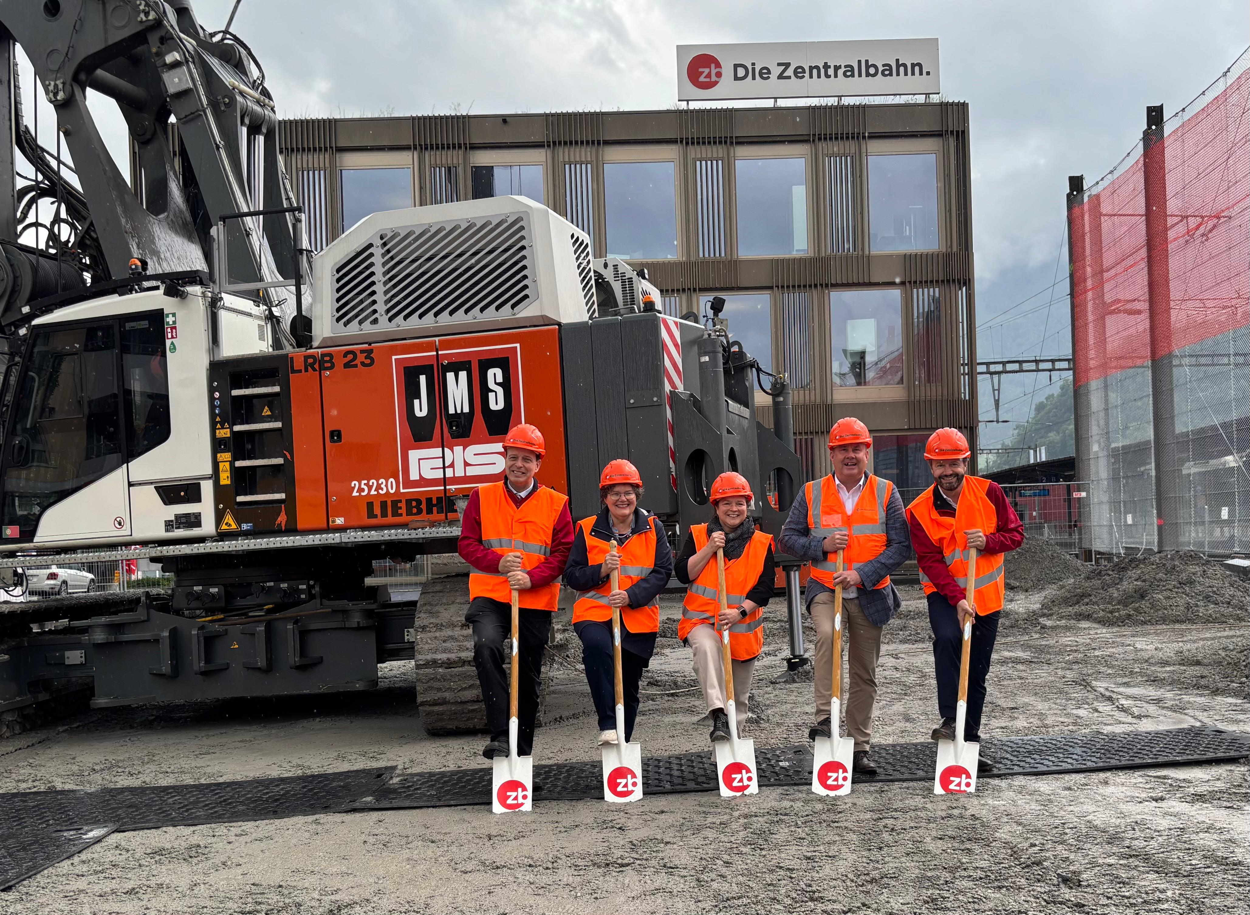 Die Zentralbahn investiert in Stansstad in ein neues Betriebsgebäude. Der moderne, viergeschossige Bau bietet zeitgemässe Räumlichkeiten für die Leitstelle und für Arbeitsplätze. Der Spatenstich erfolgte am 23. Mai 2025.