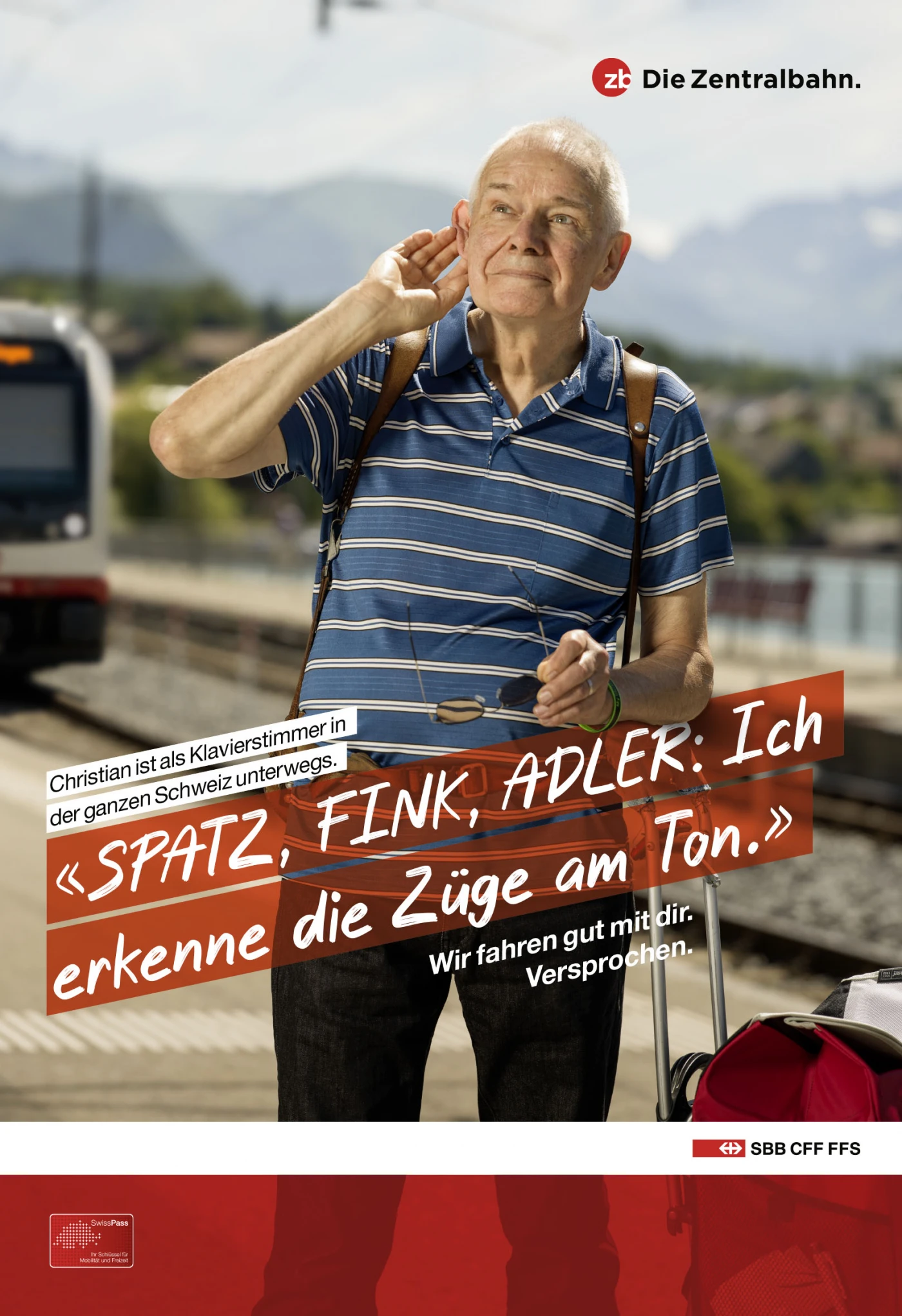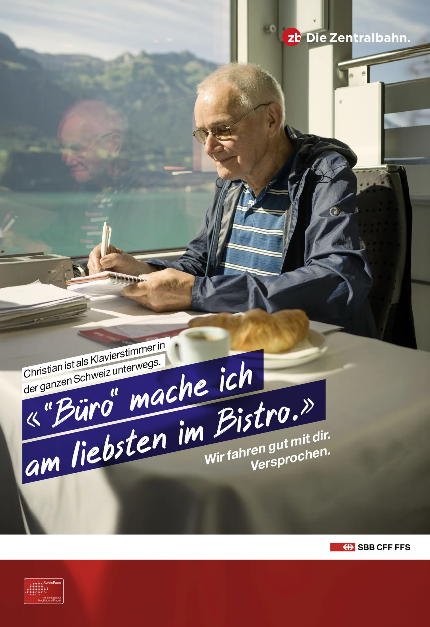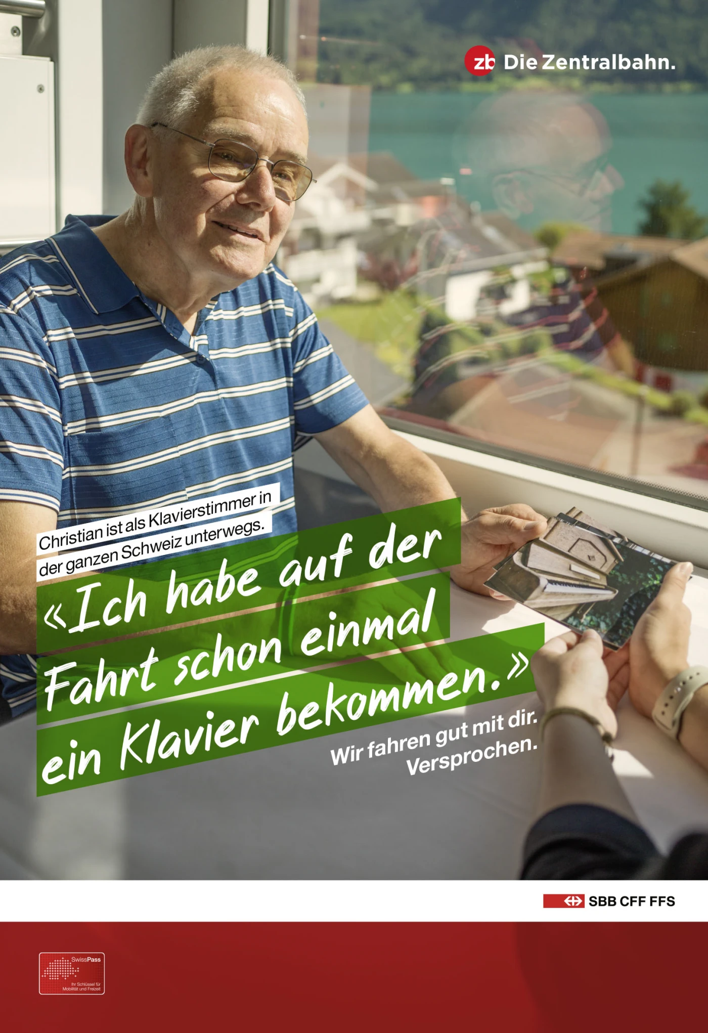 Seine Werkstatt befindet sich zwar in Meiringen, seinem Wohnort. Aber die Klaviere kommen nicht zu ihm, er muss zu ihnen. Privat pendelt Christian oft nach Embrach, wo seine Frau Gitarre unterrichtet. Das Auto kommt für ihn dabei kaum infrage: «Auto gleich Stau», meint er lachend. Die Zentralbahn habe für ihn längst eine besondere Bedeutung gewonnen. Unter anderem auch, weil er einige der Zugbegleiter:innen mittlerweile persönlich kennt. Mehr noch: Christian ist mit der Zentralbahn so vertraut, dass er ihre Züge mit verbundenen Augen am Geräusch der Lok unterscheiden könnte: «Spatz, Fink, Adler – ich erkenne sie alle.» Mit der Zentralbahn zu fahren bedeutet für ihn, jedes Mal auch ein bisschen nach Hause zu kommen.