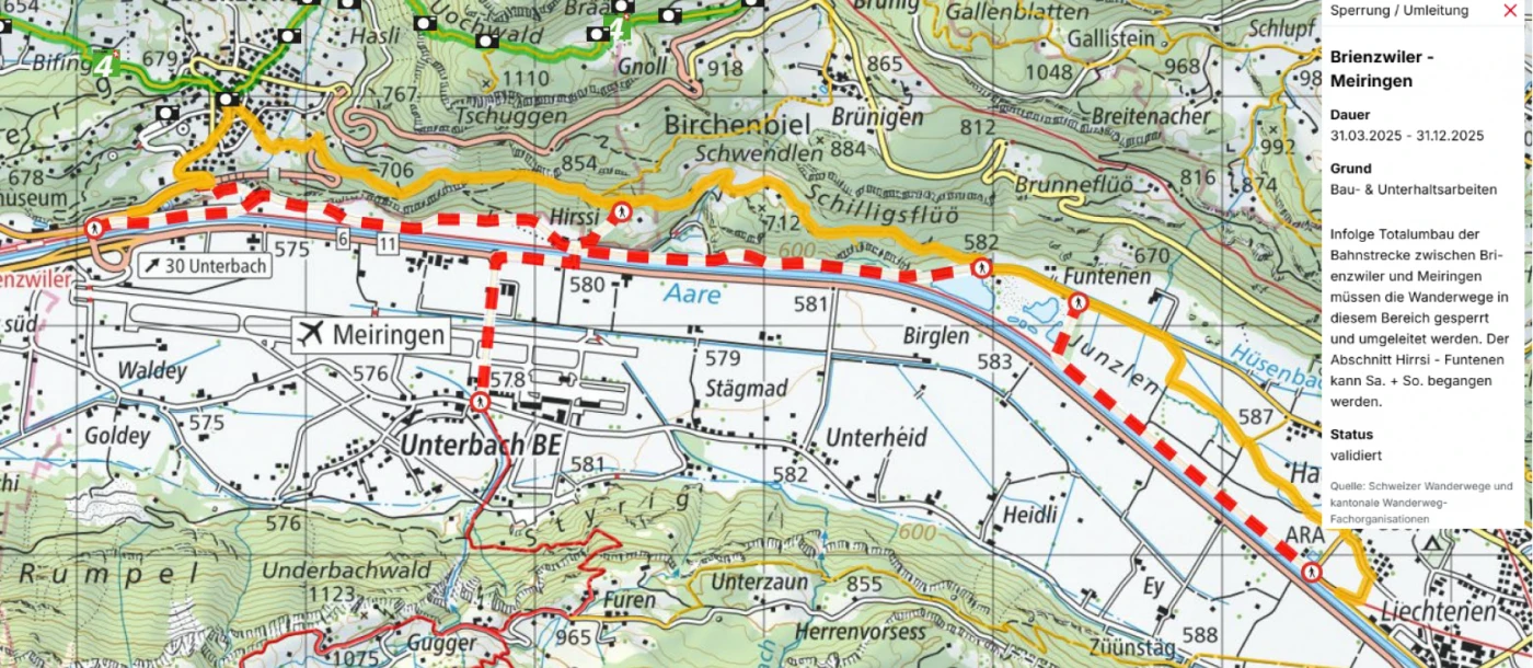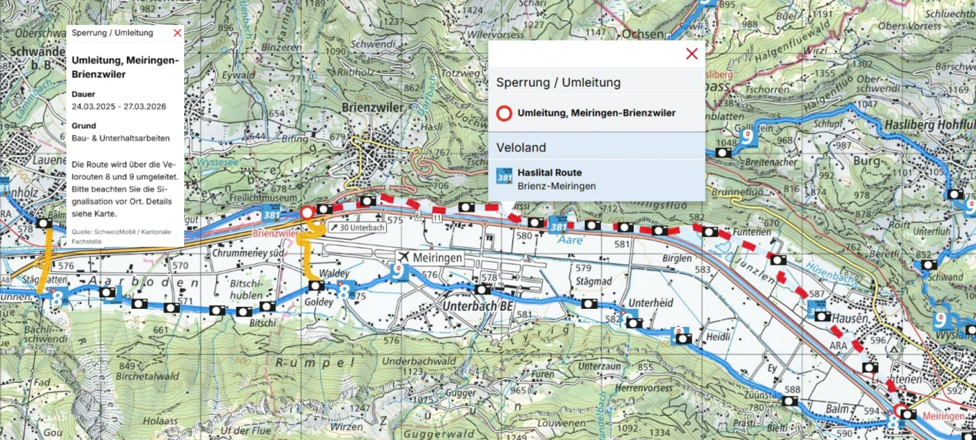 - All closures and diversions are also listed on SwitzerlandMobility (cycling and hiking trails).