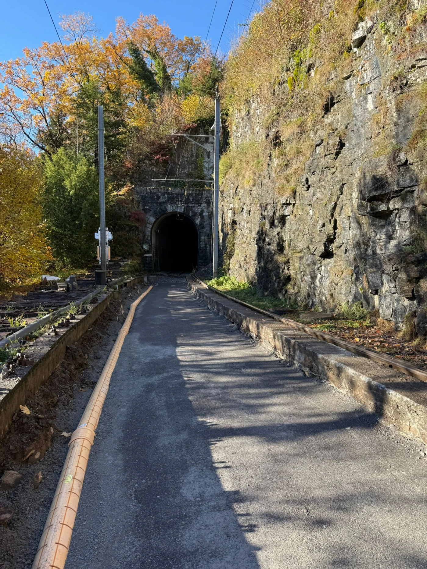 In order to continue to ensure the stability and safety of the Kirchet and Cheisten tunnels, the vaults and water ingress points were repaired in December 2024. During the total closure between Meiringen and Innertkirchen from November 3 to 30, 2025, the temporary catenary will be replaced by a ceiling conductor rail.