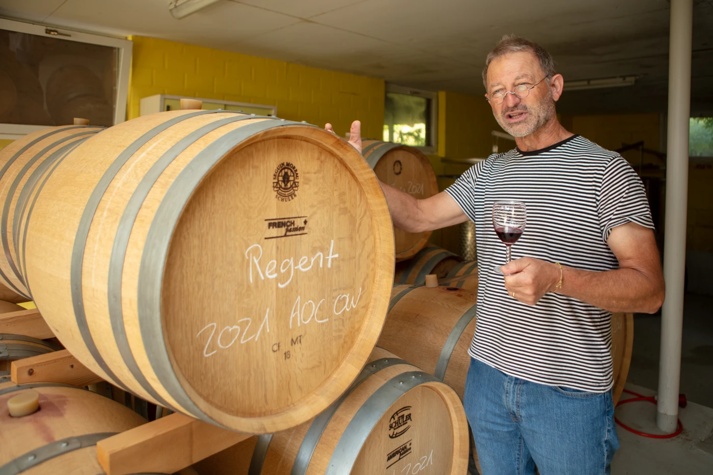 Peter Krummenacher also appreciates the varied work of a winemaker. The trained farmer and doctor of law always knew he wanted to become a winemaker. “I took over my parents’ farm with cows and pigs at a young age, completed my A-levels and studied law while continuing to work on the farm. I planted the first vines during this time. We have since stopped farming livestock. Vines have been grown here long before our time, as evidenced by field names such as “Wiibärgli” and “Rebstock” (both Swiss German words for “vineyard”). We’ve been building on this tradition for more than 20 years now.” A good year ago, he gave up practising law to concentrate on wine production. “We have now reached a level of operations that we can live from,” he says, with a mischievous look through his filigree “Chugeli” glasses. It’s not difficult to believe that he enjoys making wine. It’s now his main source of income. He grows the vines together with his wife, Karin Dähler. She is also a professional movement therapist, dedicated to mindful interaction with the body.