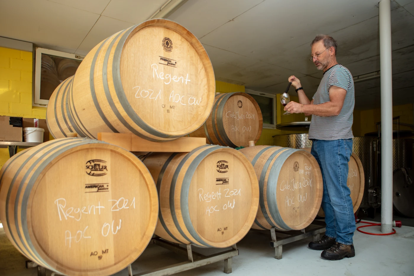 Peter Krummenacher’s approach is unconventional. He completed various courses at the Wädenswil Viticulture Centre. But intuition and learning by doing are just as important to him as what he learned there. “Sharing experiences with other professionals is beneficial. We ask each other questions and learn from one another.” The quality of his instincts is proven by awards such as “Best Central Swiss Wine 2021 - Regent Barrique 2018”. “The wine is actually made in the vineyard. You need ripe, healthy grapes. Once these most important conditions have been met, the winemaking processes in the cellar, from fermentation to bottling, simply need to be carefully regulated. This is how we turn all that hard, manual labour into success.” In addition to the vines in Tellen, Peter Krummenacher also grows grapes on the Landenberg hill in Sarnen and around the church in Sarnen. You can tell that Krummenacher is a skilled winemaker and wine lover from his response when asked about his favourite wine-growing regions in Switzerland and abroad: “I like it anywhere vines grow.” He seems deeply drawn to the atmosphere of winegrowing regions. But he is also very comfortable at home. The smart Obwalden house at the heart of the Tellen vineyard is the centrepiece of the property. As well as working there, the Krummenacher-Dähler winegrowing couple enjoy relaxing in this beautiful house.