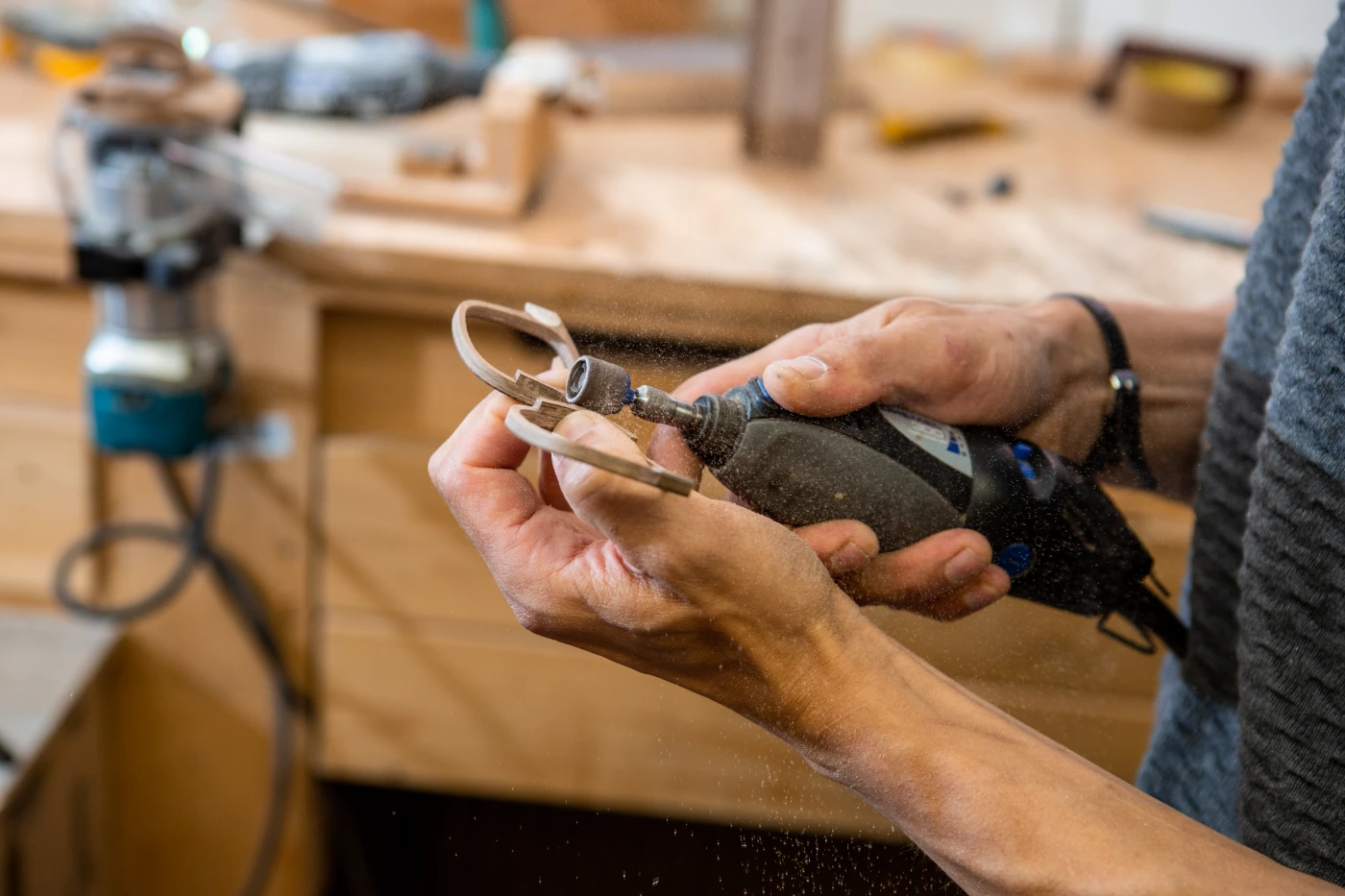Wood is often considered a durable material. It can be used in a variety of ways – from solid Swiss pine cabinets to fine toothpicks, almost anything seems possible. “The use of wood in spectacles is very delicate. Much like classic horn-rimmed glasses, making wooden glasses requires many years of experience and a feel for the material. It takes professional expertise.” Gasser sits at the workbench, picks up the die grinder and works on the nose bridge. He looks focused, his hands are nimble, his expertise is obvious. His movements are practised and confident. Initially, he worked with a gauge, but now his workshop has a small CNC machine. Nevertheless, each of his models is unique, from the structure of the wood to the individual shape and colour.