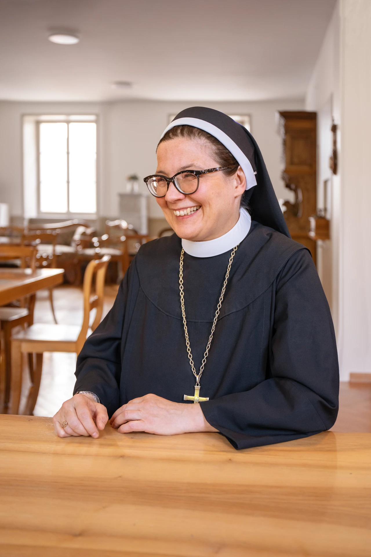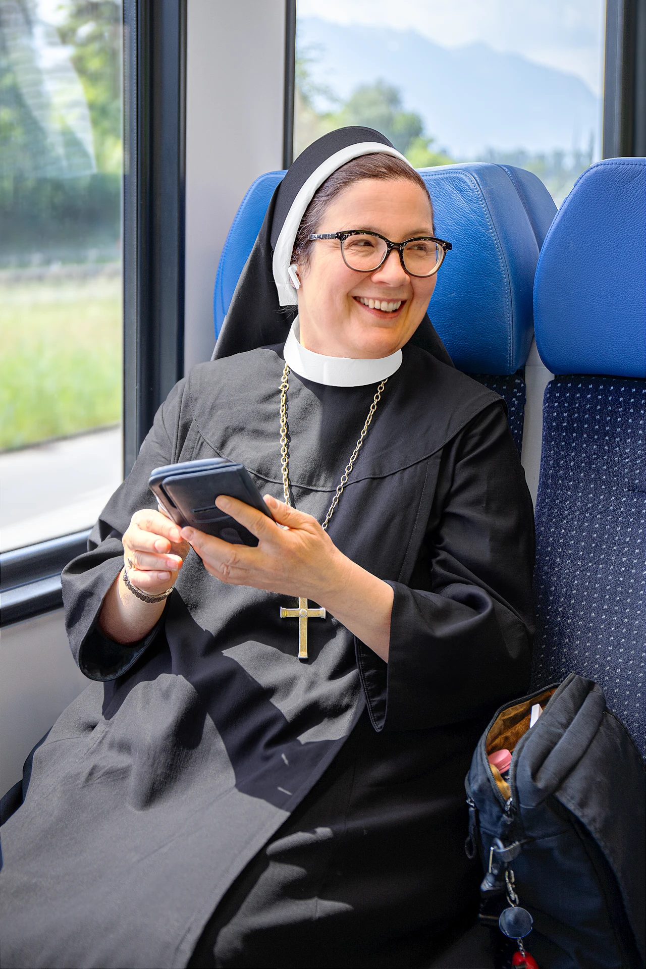 Nun Rut-Maria is abbess at the Benedictine convent of St. Andreas in Sarnen. At the age of 21, the native of eastern Switzerland exchanged her secular life for a union with God and has since moved effortlessly between the two worlds. She loves silence and Jethro Tull, wears her SC St. Gallen fan scarf even with her habit, and reads the Bible or really good crime novels on the train. The unconventional nun has already traveled to many countries around the world. She has used public transportation her whole life because she does not have a driver's license. Nun Rut-Maria considers the reliability of the Zentralbahn a privilege, and finds its palpable humanity equally remarkable. That is why traveling by train is not a matter of faith for her. “Iisi Bahn connects”.