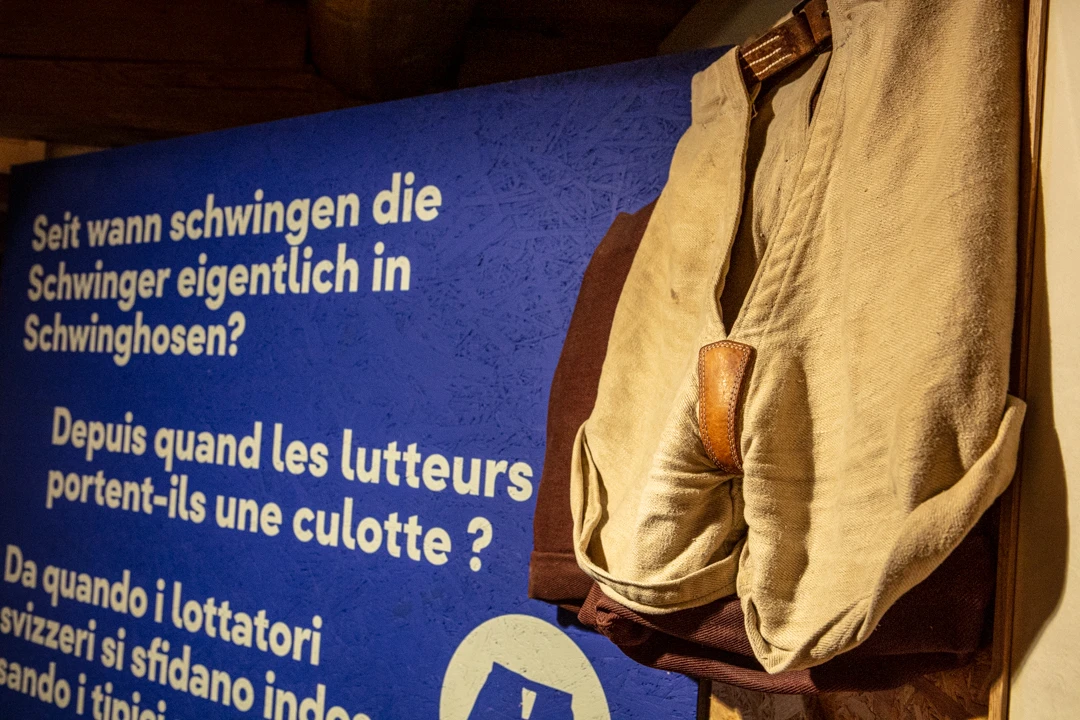 He was very successful from 1956 to 1978. Some of his records remain unbroken to this day. “In 2019, we received memorabilia from Karl Meli's estate and took this as an opportunity to put together a special exhibition about Schwingen”, explains Koring. Speaking of records, the world’s largest Schwingen breeches hang over the sawdust circle at the entrance. And what makes them the toughest trousers in Switzerland, or indeed anywhere, is the special Zwilch fabric and its manufacture. Here too, you can – in fact, you should – interact with the exhibit and try to tear the fabric: who is stronger? The exhibition also focuses on many other aspects of the traditional Swiss wrestling.